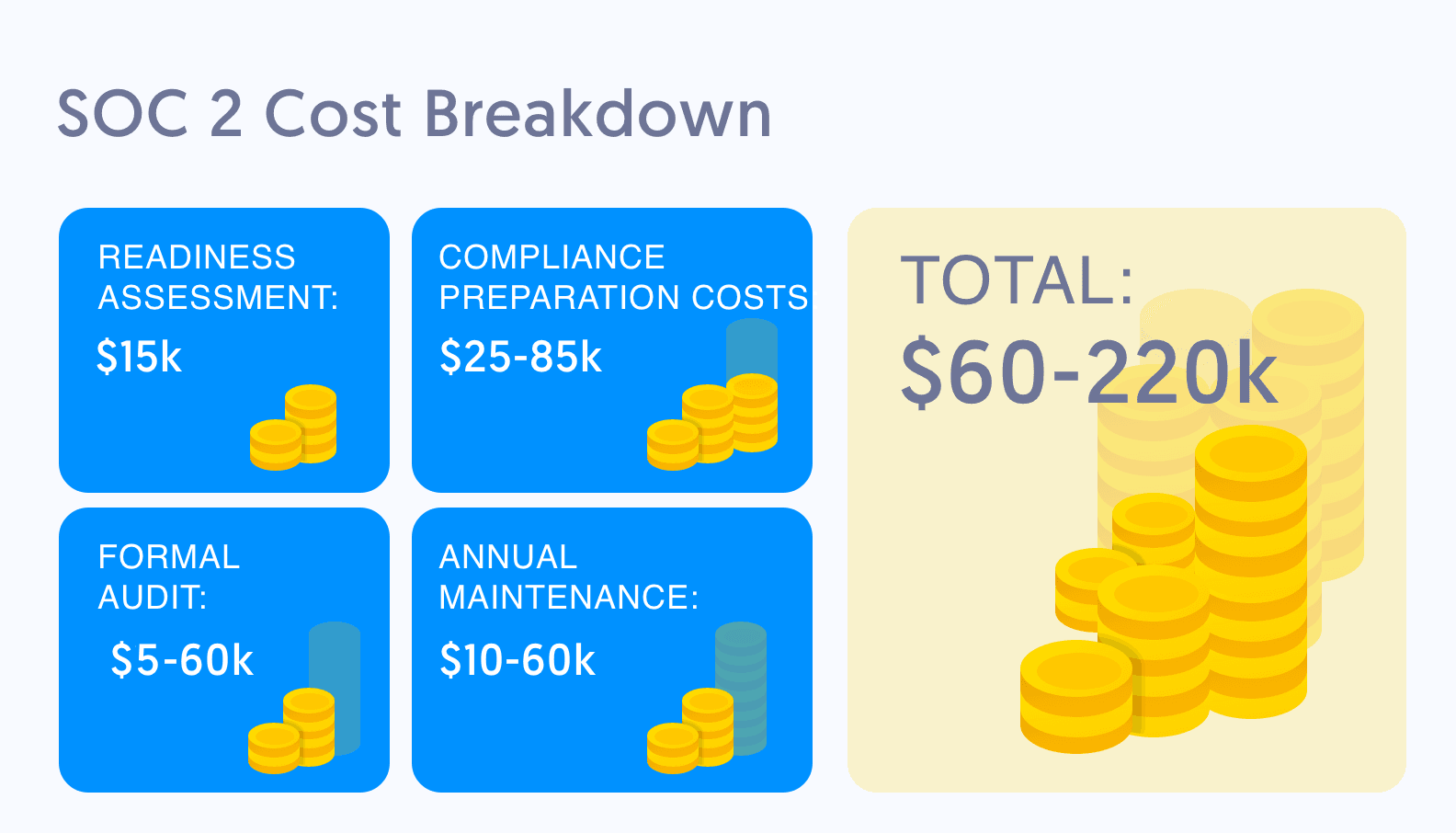 Between preparation and the audit itself, the total cost of achieving SOC 2 compliance can land between $60k and over $100k. And because SOC 2 reports need to be renewed on an annual basis, many of these are recurring costs.