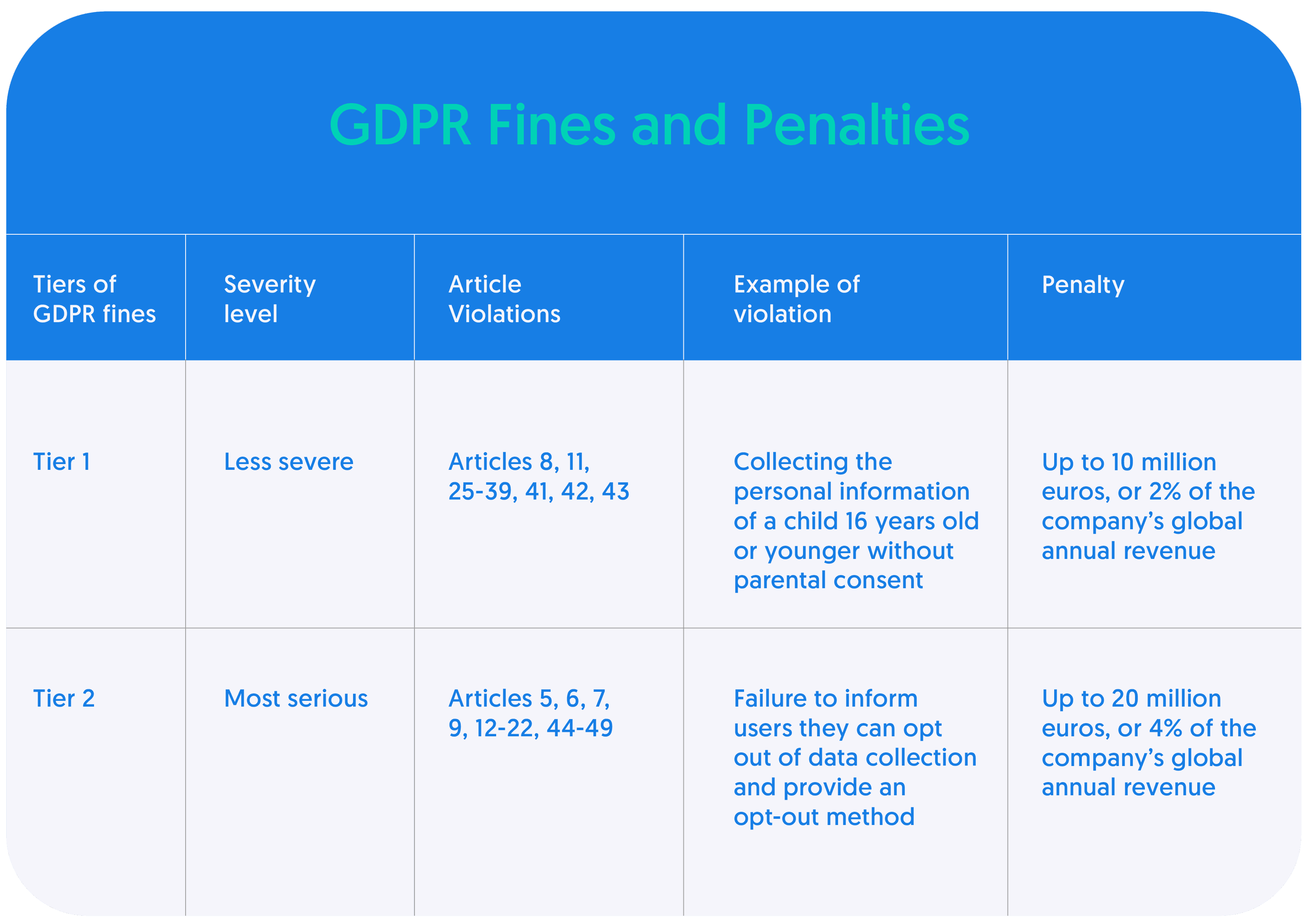 There are two tiers of penalties, depending on the severity of the violation. Less severe violations can result in fines of up to 10 million euros, or 2% of the company’s global annual revenue from the previous financial year, whichever is higher.