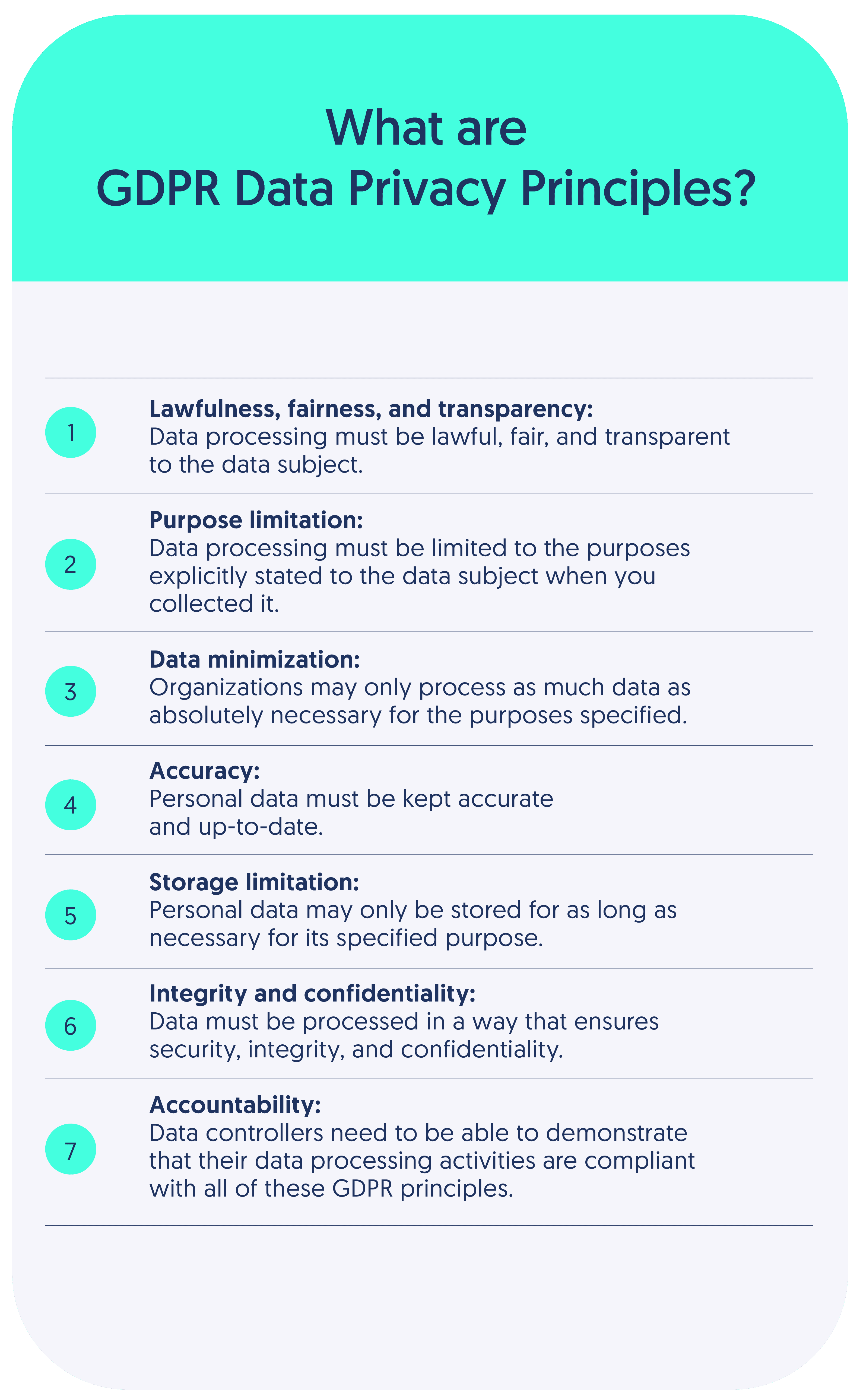 These are not explicit instructions for how to comply with GDPR. Instead, they reflect the ethos of the data privacy regulation and help guide organizations in how they process personal information and formulate their data protection protocols.