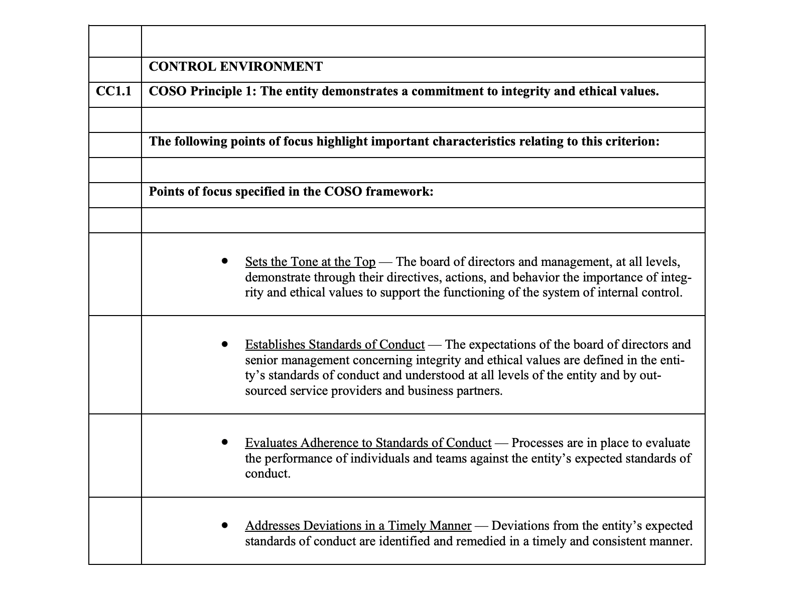 Here’s an example from the AICPA SOC 2 guide showing points of focus for CC1.1: Demonstrating a commitment to integrity and ethical values.