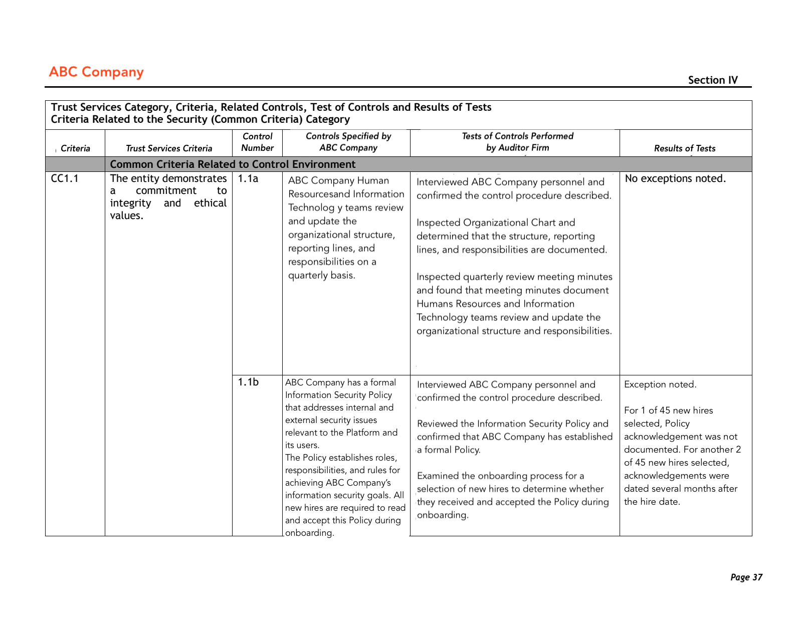 This test reviews ABC Company's internal controls under the Control Environment (CC1) criteria. The auditor checks whether the company “demonstrates a commitment to integrity and ethical values” (Trust Services Criteria) by reviewing controls related to information security policies.